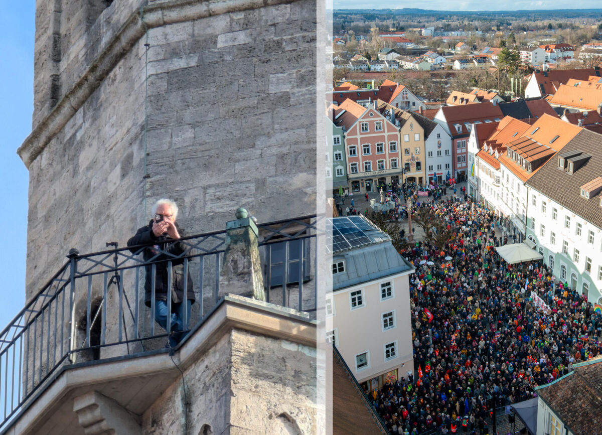 die positive Energie dieser lebendigen und vielfältig-bunten Demonstration für Demokratie und Menschenwürde war bis zum Kirchturm rauf zu spüren. Ich hatte dort für "Wir in Weilheim" die Aufgabe übernommen, die TeilnehmerInnen zu zählen und Überblick zu halten, damit die geplanten Umleitungs-Maßnahmen zum richtigen Zeitpunkt erfolgen konnten. Um 14:00 verteilten sich über 4000 Menschen am Marienplatz und Kirchplatz und setzen ein deutliches Zeichen, über das die Medien in ganz Deutschland berichteten.