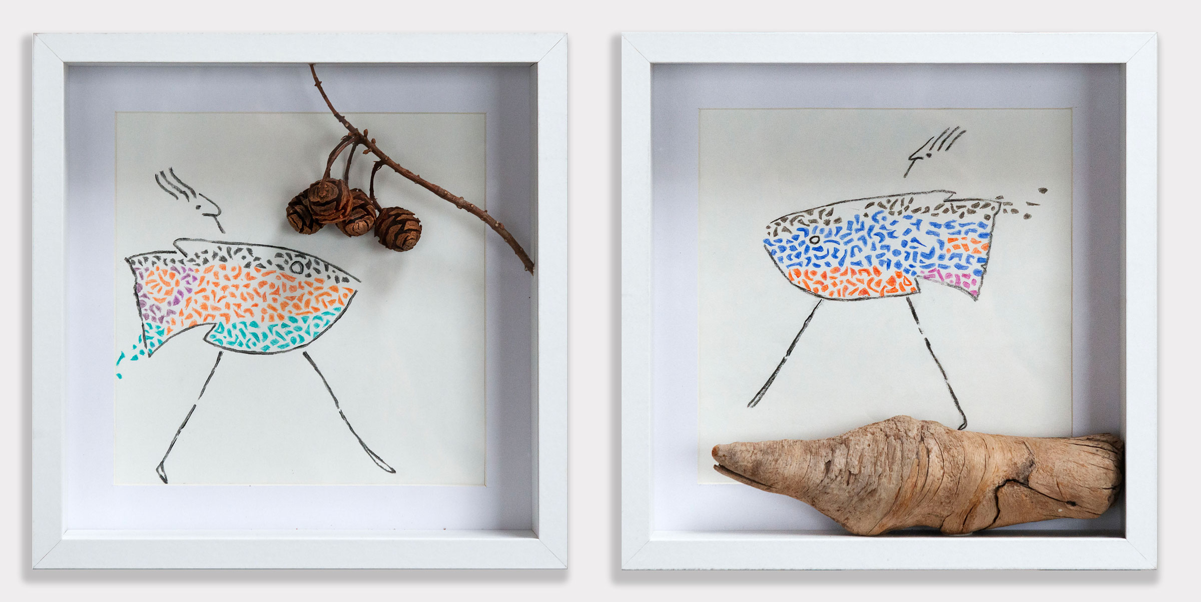 „Begegnung 1“ (2026) 25 x 25 x 6 cm, im Objektrahmen Zeichnung auf Papier, Holz-Fundstück Preis 180,-