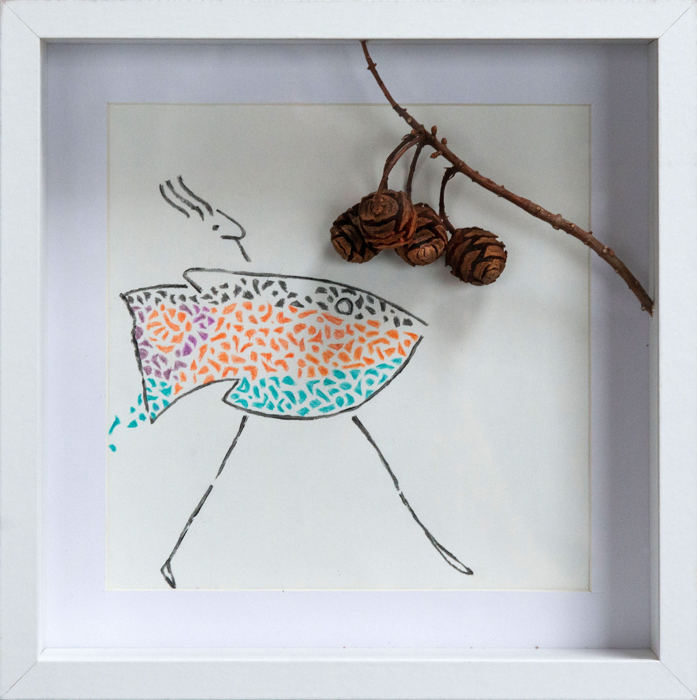 „Begegnung 2“ (2026) 25 x 25 x 6 cm, im Objektrahmen Zeichnung auf Papier, Holz-Fundstück Preis 180,-