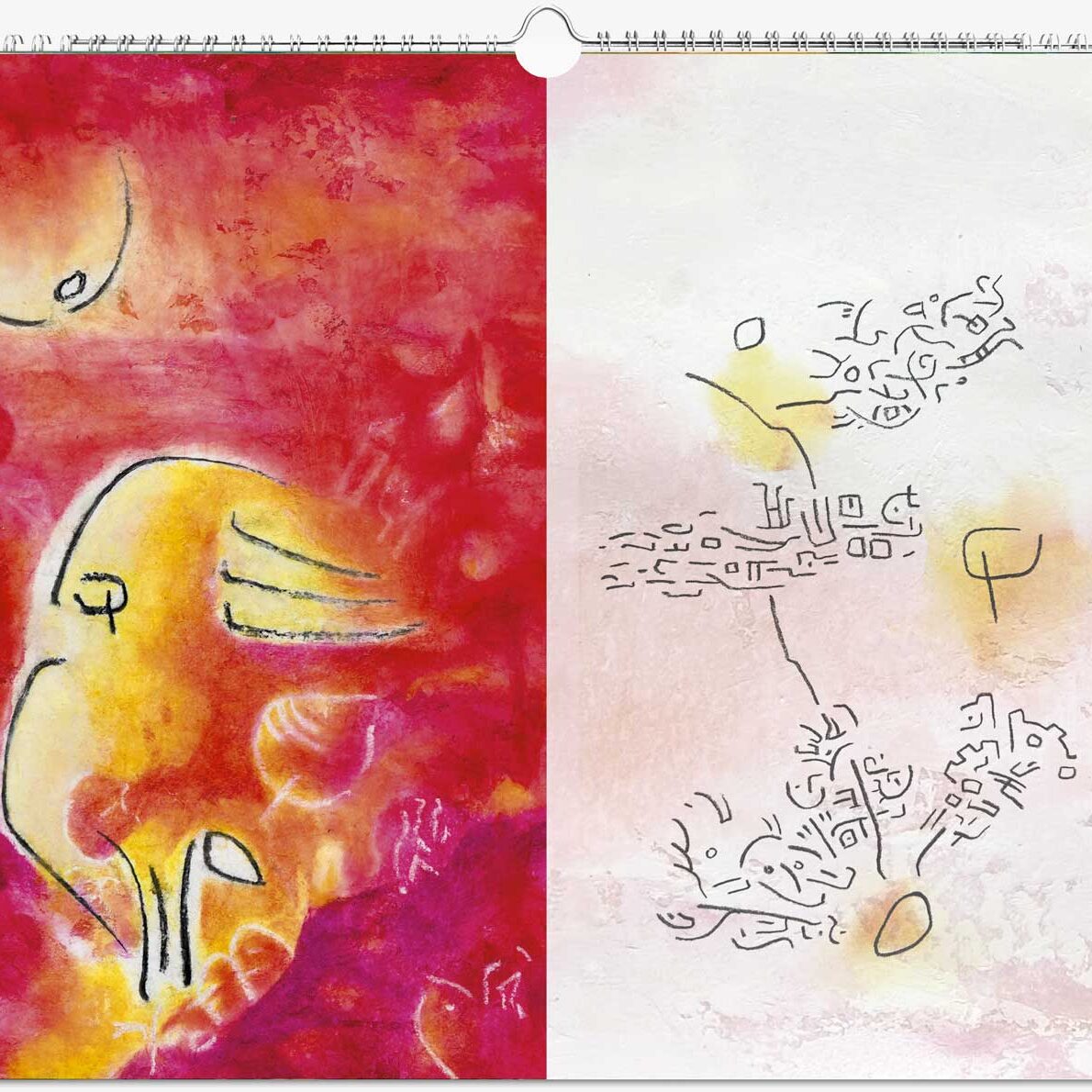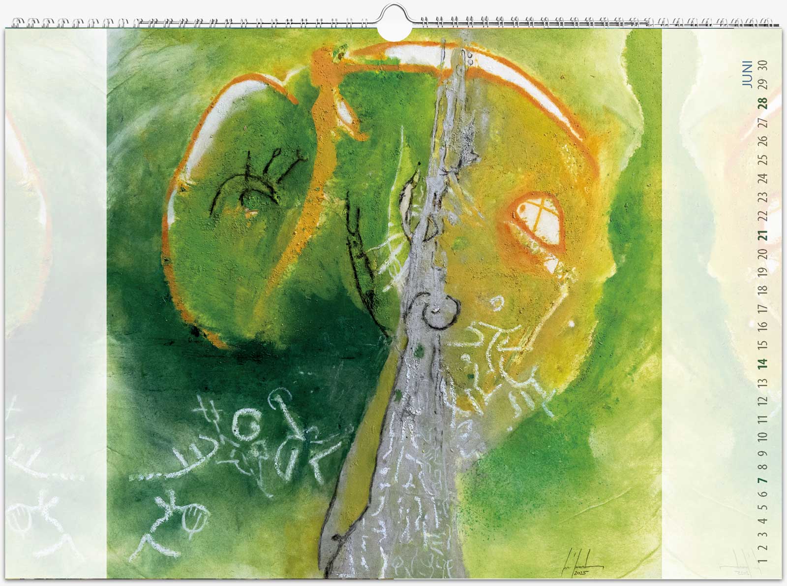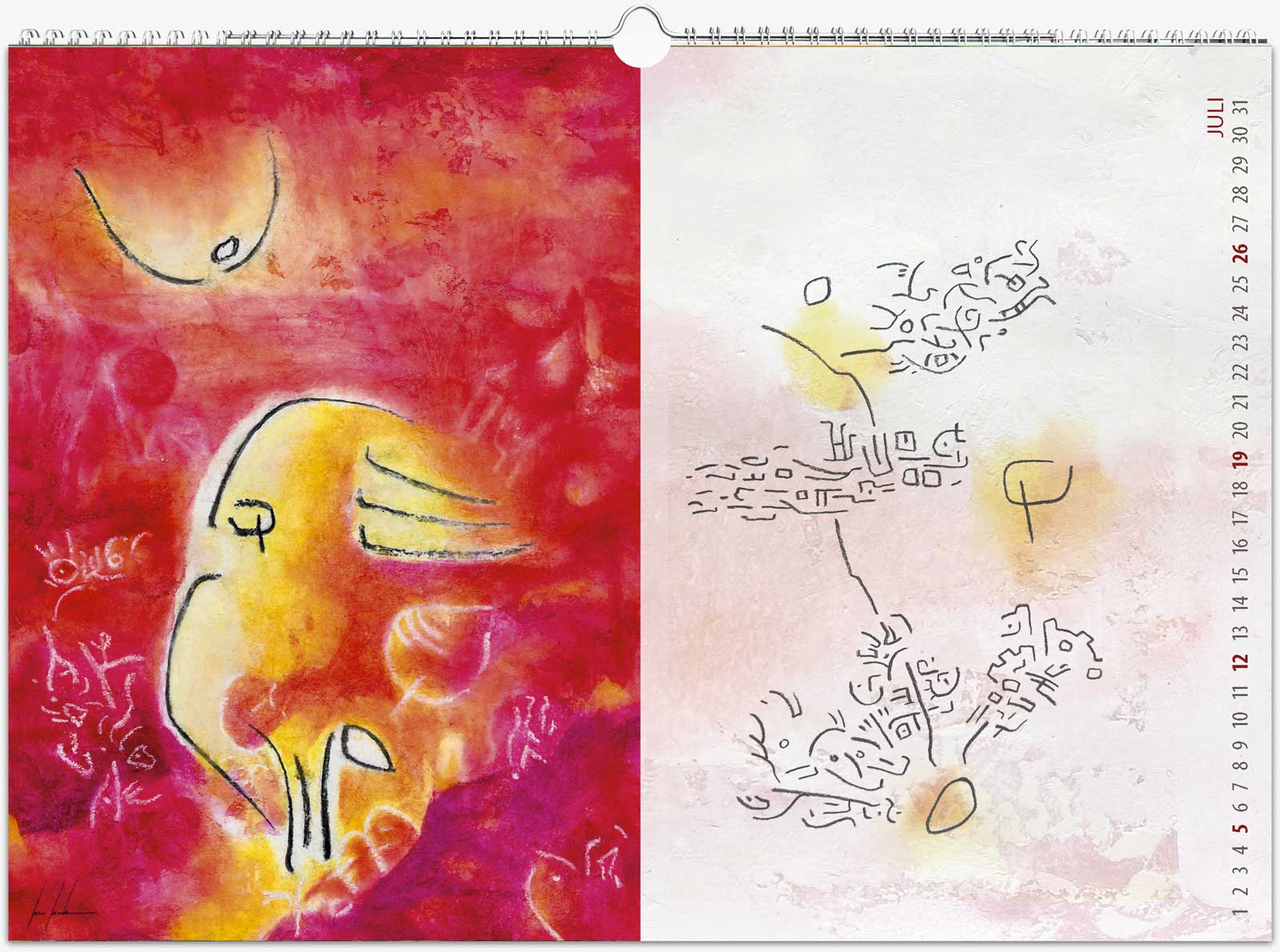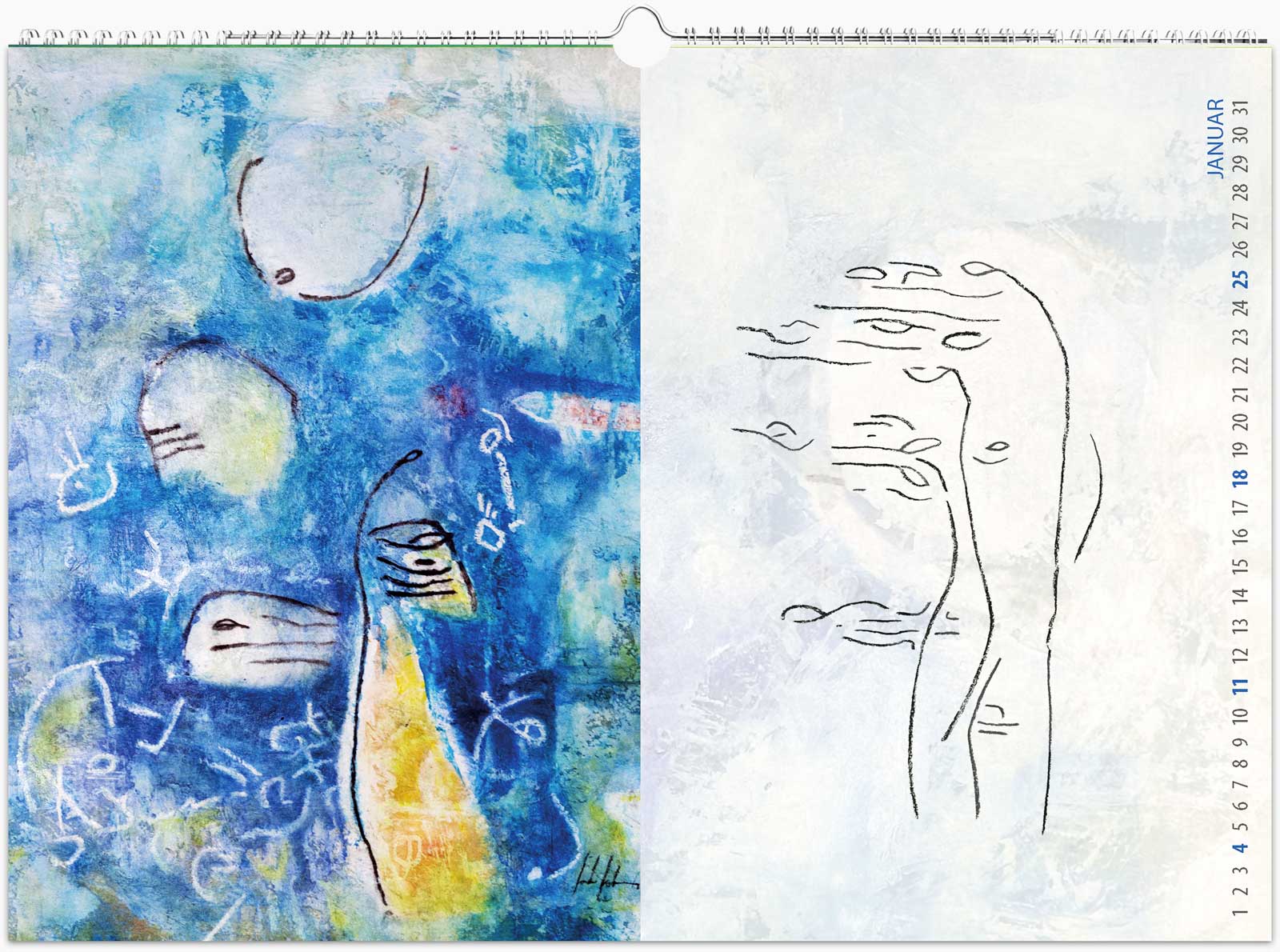 Dieser neue Kalender steht als Künstleredition für sich. Zusätzlich laden die Motive monatlich dazu ein, über das reine Betrachten hinaus zu gehen und selbst damit kreativ weiter zu arbeiten. Dies ist möglich mit einer konkreten Fragestellung oder völlig offen. Vorlage in Ruhe betrachten, ausreichende Zeit auf sich wirken und sich dabei inspirieren lassen, um dies im eigenen spielerischen Ausdruck umzusetzen – in jeder Form von Kunst und Lebenskunst: Als Geschichte, Musik, Gesang, Klangraum, Theater, Tanz, Skulptur, Malerei, wie auch im pädagogischen oder therapeutischen Kontext, einzeln oder in Gruppen, im Beruf, in der Weiterbildung oder privat. Ich wünsche viel Freude dabei!