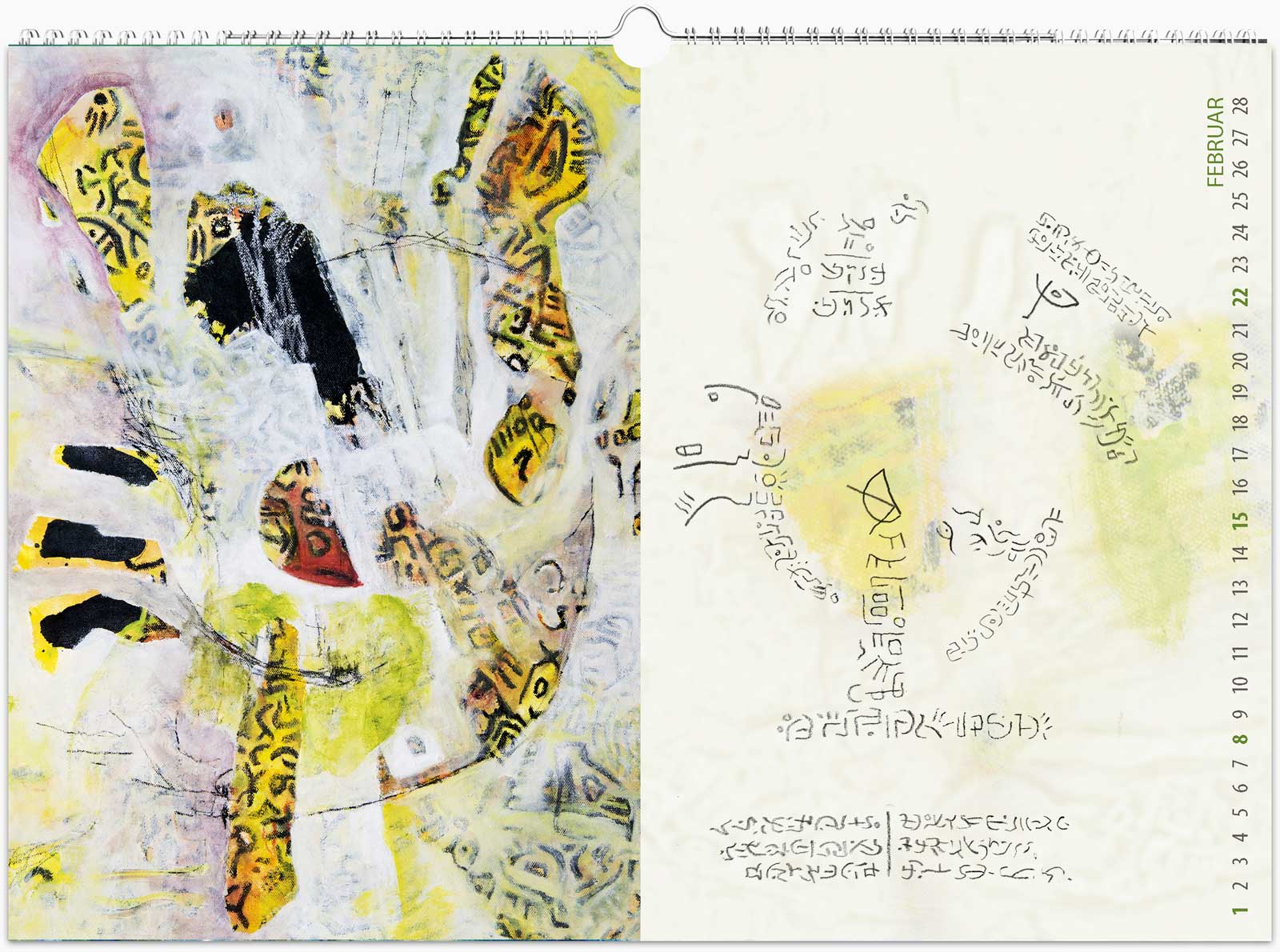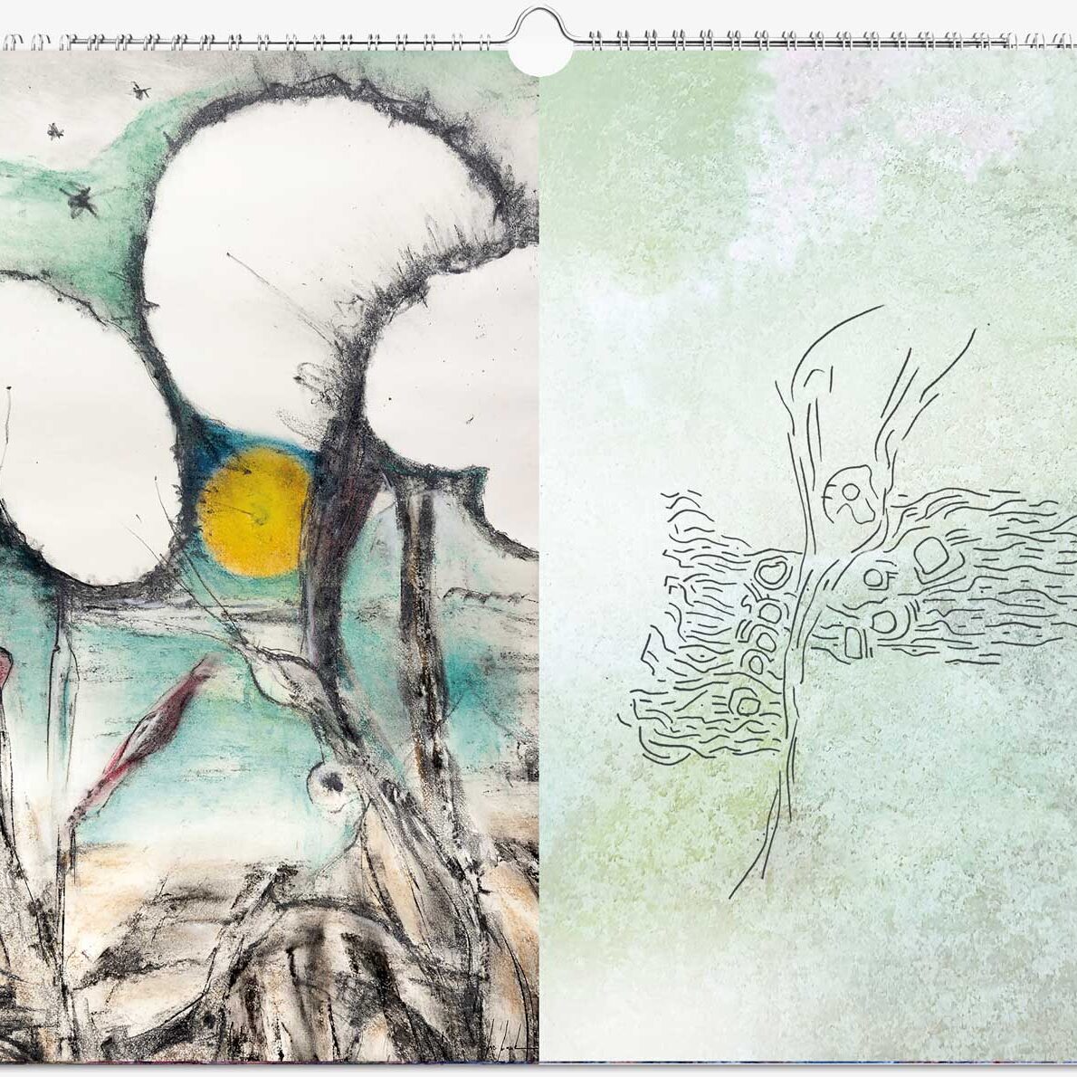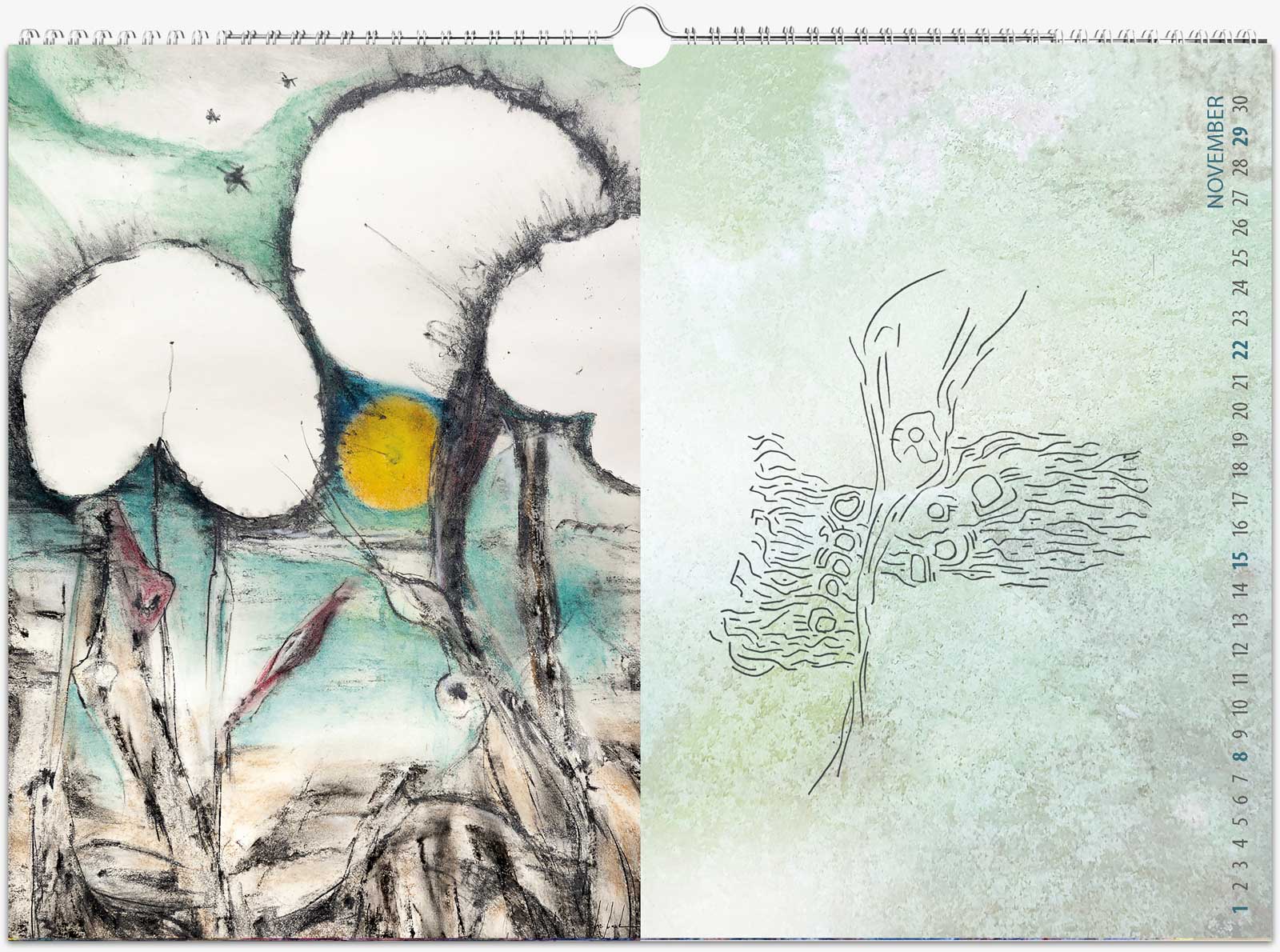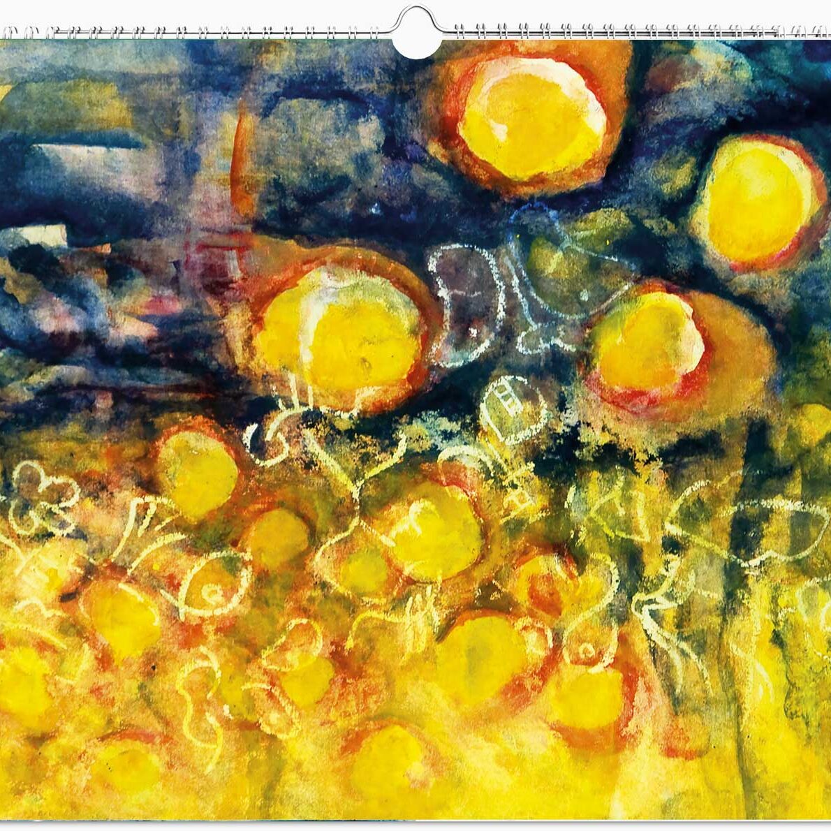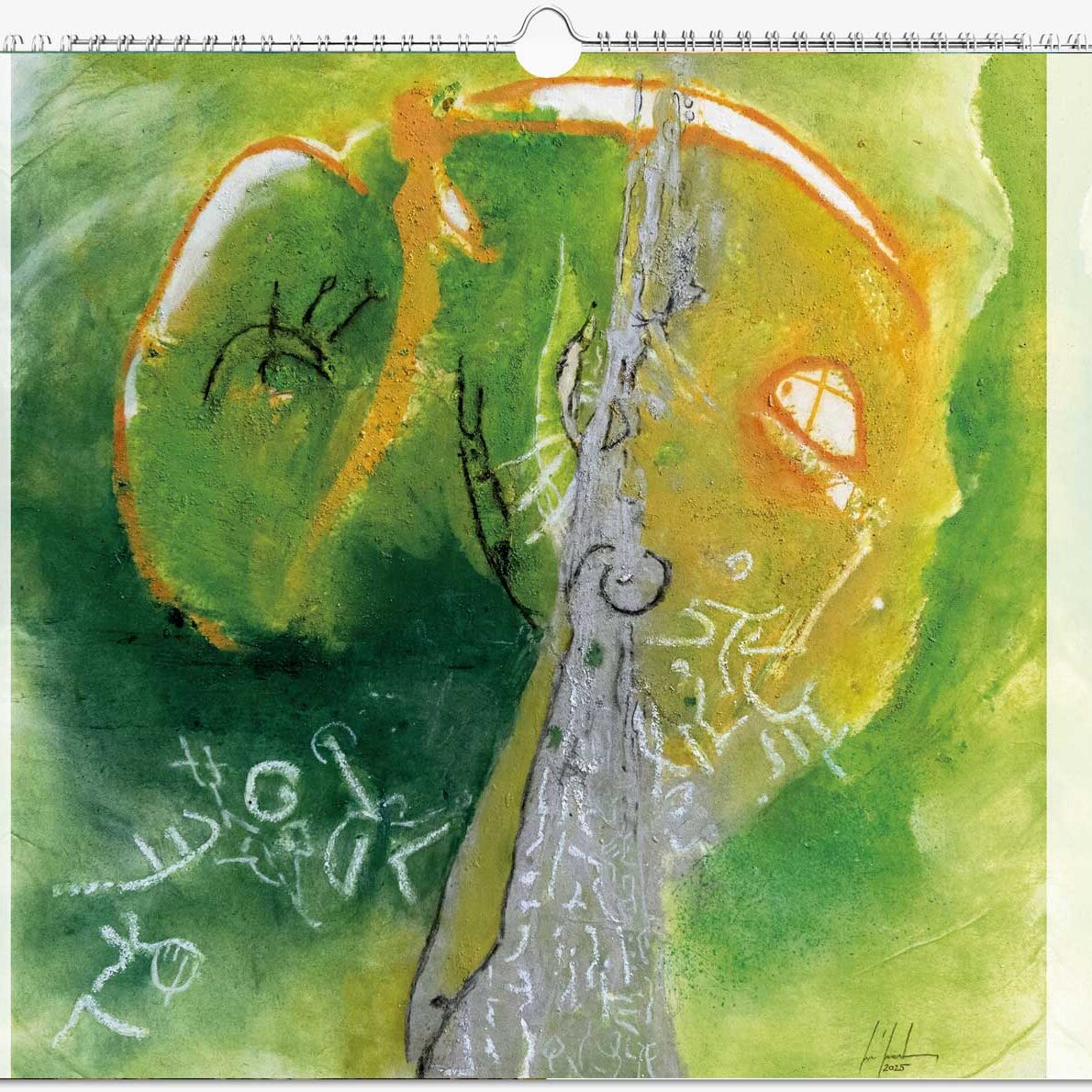 Dieser neue Kalender steht als Künstleredition für sich. Zusätzlich laden die Motive monatlich dazu ein, über das reine Betrachten hinaus zu gehen und selbst damit kreativ weiter zu arbeiten. Dies ist möglich mit einer konkreten Fragestellung oder völlig offen. Vorlage in Ruhe betrachten, ausreichende Zeit auf sich wirken und sich dabei inspirieren lassen, um dies im eigenen spielerischen Ausdruck umzusetzen – in jeder Form von Kunst und Lebenskunst: Als Geschichte, Musik, Gesang, Klangraum, Theater, Tanz, Skulptur, Malerei, wie auch im pädagogischen oder therapeutischen Kontext, einzeln oder in Gruppen, im Beruf, in der Weiterbildung oder privat. Ich wünsche viel Freude dabei!