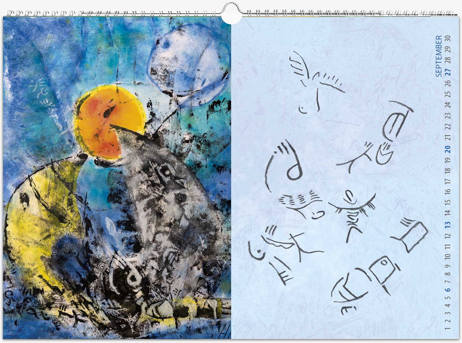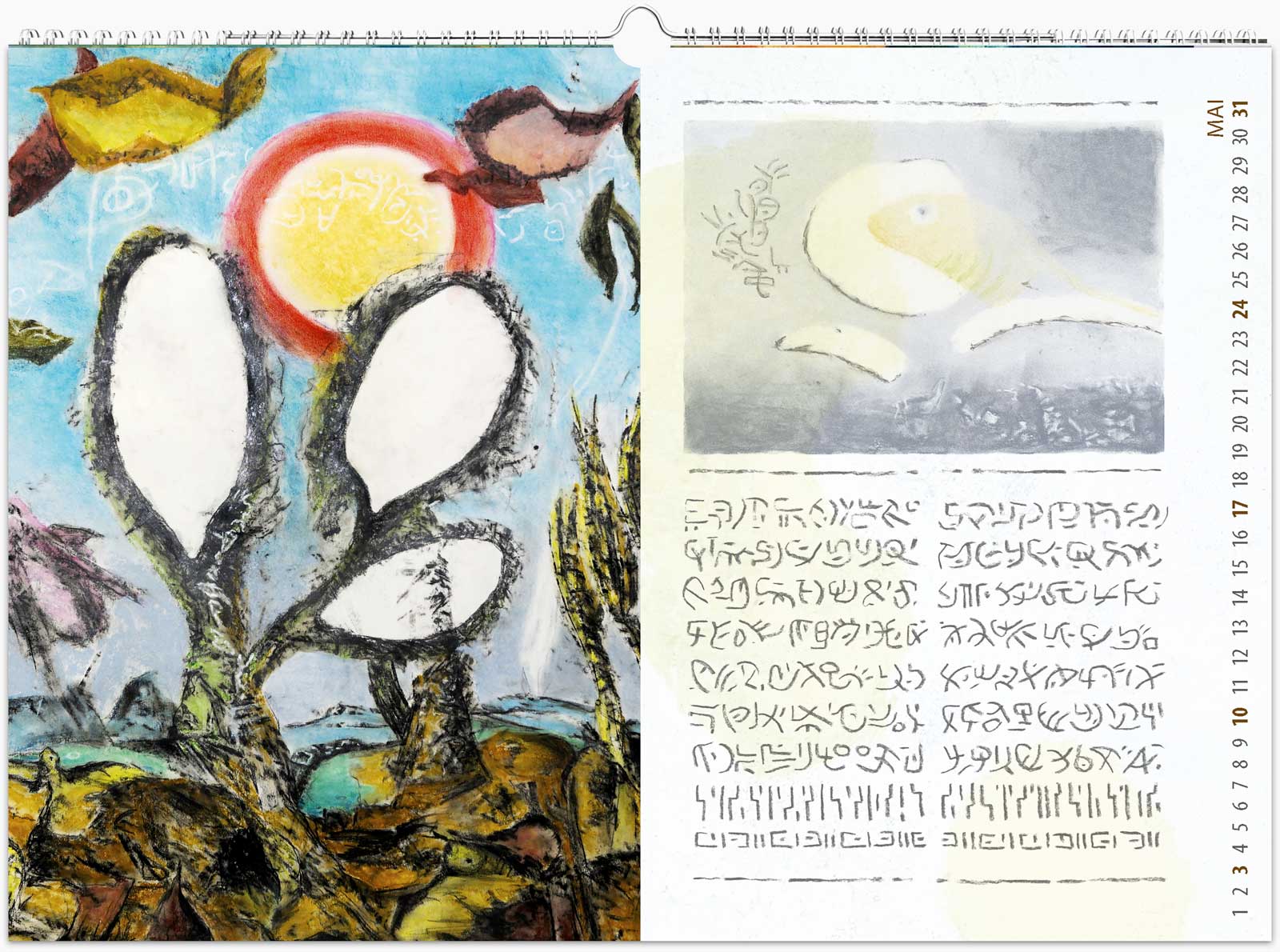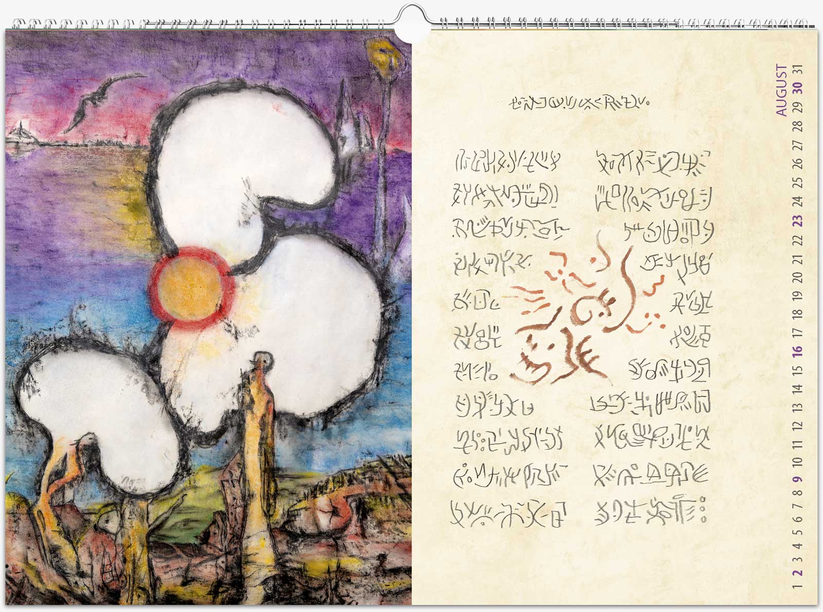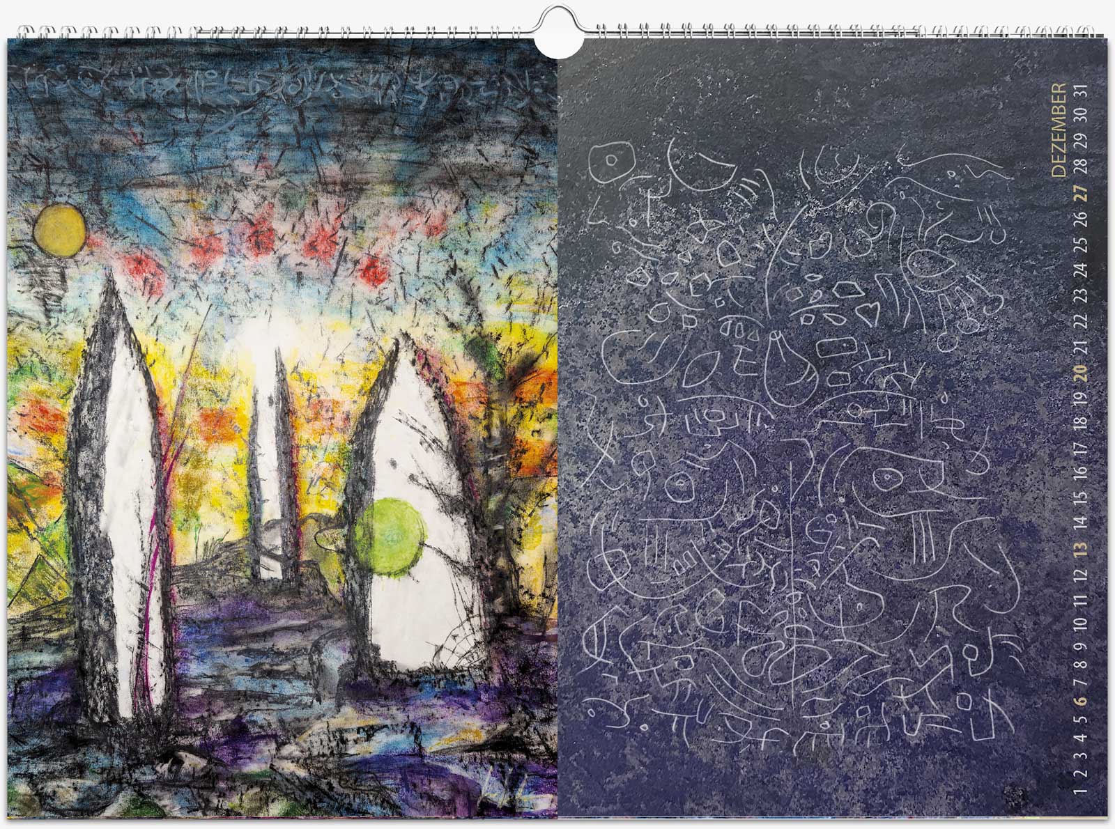Dieser neue Kalender steht als Künstleredition für sich. Zusätzlich laden die Motive monatlich dazu ein, über das reine Betrachten hinaus zu gehen und selbst damit kreativ weiter zu arbeiten. Dies ist möglich mit einer konkreten Fragestellung oder völlig offen. Vorlage in Ruhe betrachten, ausreichende Zeit auf sich wirken und sich dabei inspirieren lassen, um dies im eigenen spielerischen Ausdruck umzusetzen – in jeder Form von Kunst und Lebenskunst: Als Geschichte, Musik, Gesang, Klangraum, Theater, Tanz, Skulptur, Malerei, wie auch im pädagogischen oder therapeutischen Kontext, einzeln oder in Gruppen, im Beruf, in der Weiterbildung oder privat. Ich wünsche viel Freude dabei!