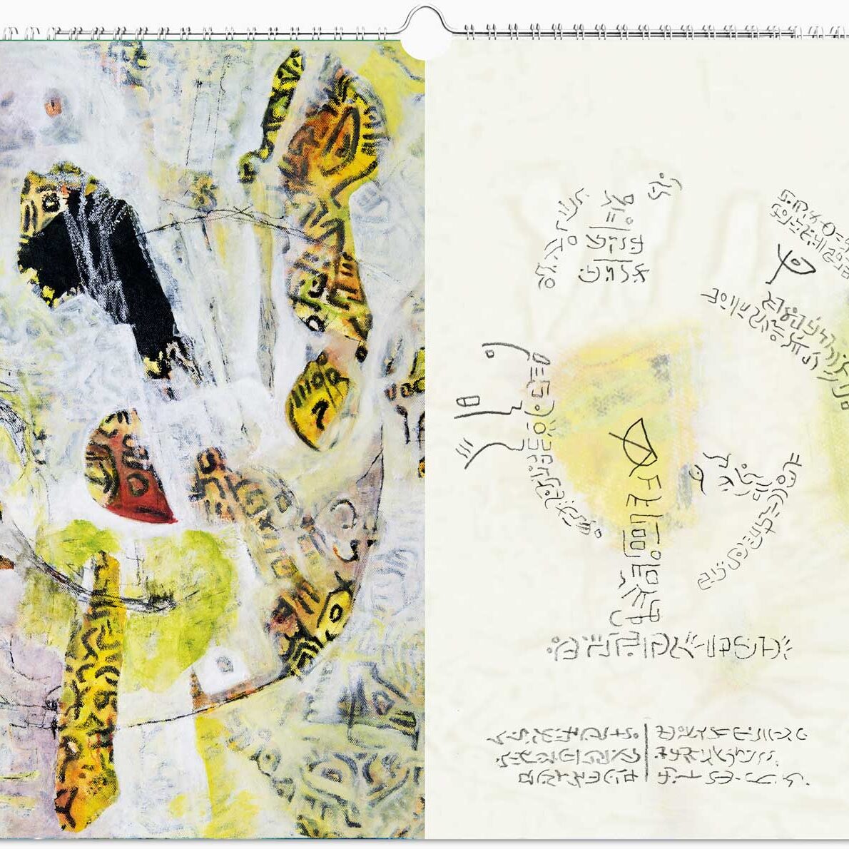 „Im Dialog der magisch anmutenden Zeichen mit feinen Farben und komplexen Formen der Bilder auf der linken Buchseite entstehen Portale – hin zu einer wachen, ruhigen, spürenden Präsenz des Geistes.“